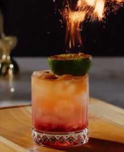 A bold bourbon cocktail with bright pineapple and fresh lime, balanced by subtle sweetness and bitter Campari, layered with orange bitters and finished with cassia cinnamon and a flaming lime garnish.