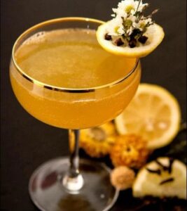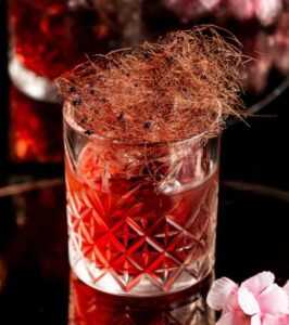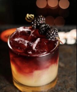A bold, layered cocktail that blends smooth whisky, bright citrus, and a hint of peach with a rich red wine float. Lightly sweet, slightly tart, and visually striking, it’s a dramatic sip with a refined finish.